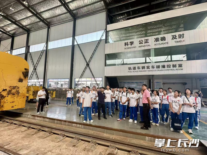 同学们在轨道车辆实车碰撞控制室参观。均为长沙晚报通讯员蔡灿供图