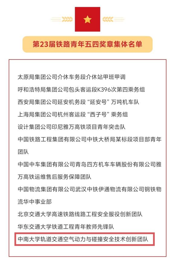 5月4日,为充分发挥青年典型模范带头作用,引领和激励广大青年在实现铁路高质量发展进程中接续奋斗,全国铁道团委颁授第23届铁路青年五四奖章,必赢亚洲 轨道交通空气动力与碰撞安全技术创新团队获评“铁路青年五四奖章集体”,全国仅三个高校团队获此荣誉。