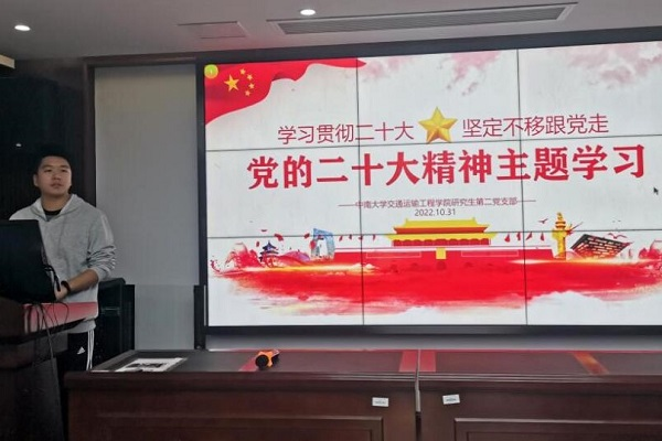 10月31日晚上19:00,研究生第二党支部于交通楼425教室开展了“学习贯彻二十大,坚定不移跟党走”党的二十大精神专题学习大会。会议由支部书记曾捷同志主持,支部全体党员、部分入党积极分子及入党申请人参加了本次会议。