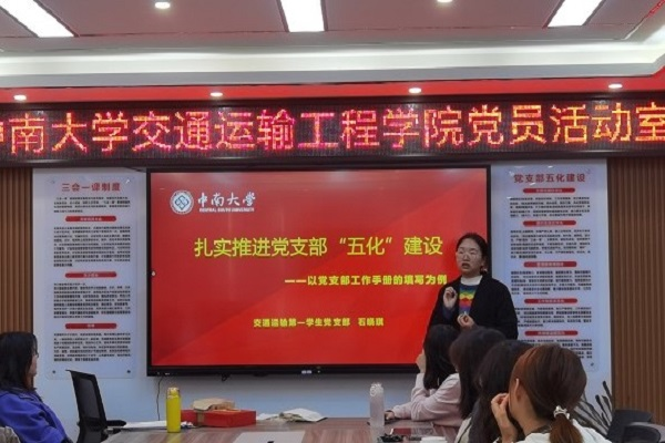 接着,支部书记石晓琪老师先对两位同志的学习展示进行了总结并给予了肯定,然后为同志们进行了“扎实推进党支部‘五化’建设”党课讲解。她指出,支部同志都应加强党务知识的学习。关于支部工作手册等档案的填写,她表示同志们填写资料需保证规范并逐步跟进,避免后期工作量堆积,她也从多个方面对党内各项活动及会议的开展进行了详细的讲解。另外,石老师还提到支部驻班党员需要深入团支部,主动去指导团支部日常工作的开展,积极了解大家的思想动态,为更好地开展党员发展工作奠定基础。