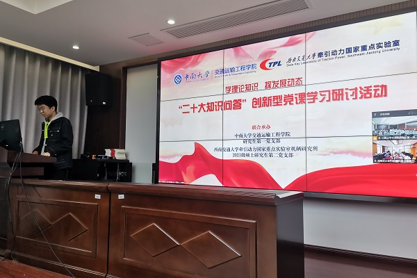12月3日下午15:00,必赢官网 研究生第一党支部于交通楼425开展与西南交通大学牵引动力国家重点实验室机车车辆研究所2021级硕士研究生第二党支部联合举办的“青春献礼二十大,强国有我新征程”支部共建系列活动第二期——“学理论知识,探发展动态”创新型党课学习研讨,活动由双方支部书记刘家忱同志和黄勉同志主持,双方支部全体党员和入党积极分子参加本次活动。