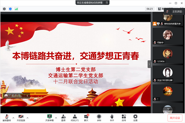 1月5日晚上20:00,必赢亚洲 第二学生党支部、博士研究生第二党支部联合于线上举行“本博链路共奋进,交通梦想正青春”党日活动。本次活动面向全院本科生,有来自四个年级的70余名同学参加,活动由曾怡佳同志主持。