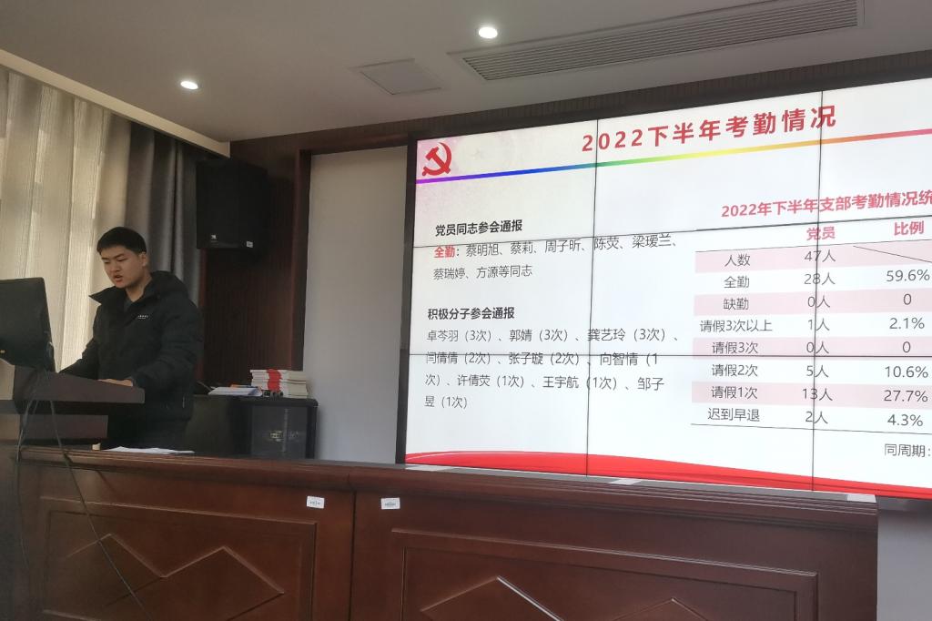 接着,纪检委员赵志强同志对2022年下半年支部在各项组织生活及党日活动中的考勤情况进行了总结,并对支部的考勤管理制度进行了进一步的讲解与说明。支部副书记战映辰同志总结了支部成员在学习强国APP上的学习情况,对年度学习积分排名前五的同志进行了表扬并颁发奖品,同时对支部未来的理论学习作出具体要求。