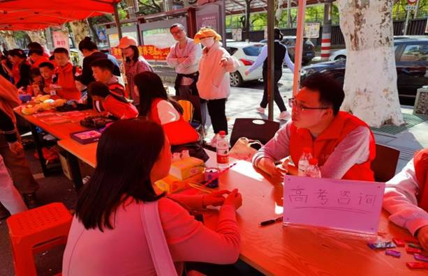 考学分享助力青年一代。支部于下午14:00在清水塘社区学雷锋志愿服务爱心集市开展考学分享义务咨询志愿服务活动,支部共设置4个考学咨询摊位、9名答疑人员,支部学子们充分发挥考学特长,从院校专业、应试技巧、心理疏导和理想规划等方面积极为高三的学生和家长释难解惑、帮扶指导。
