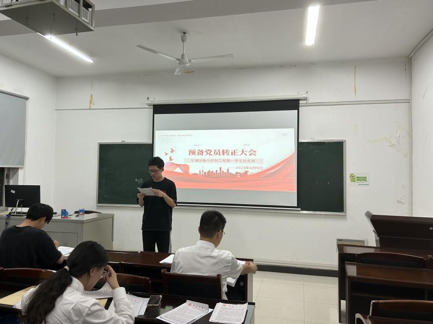 6月9日晚19:30,交通设备与控制工程第一学生党支部在交通楼515召开预备党员转正暨接收预备党员大会。会议由支部副书记黎瑞同志主持,支部全体党员同志参加此次会议。
