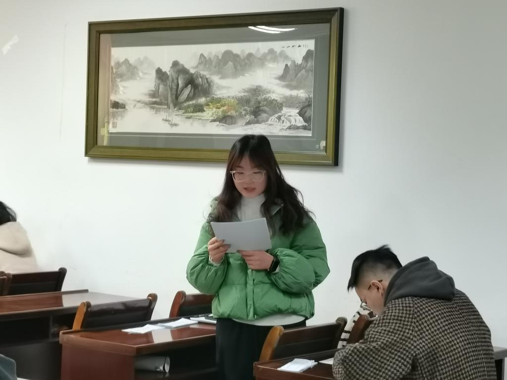 会议伊始,支部全体成员起立,奏唱国歌。在马珊同志简要介绍完会议的流程及要求后,支部大会开始讨论预备党员转正的相关事宜。张子璇、卓岑羽、郭婧、向智情、龚智龙、罗沁婵、晋佳利、傅敬恩八位同志依次上台宣读转正申请书,汇报了个人成为预备党员后在政治思想、学习生活、工作表现等方面的基本情况,并进行了自我总结和批评。