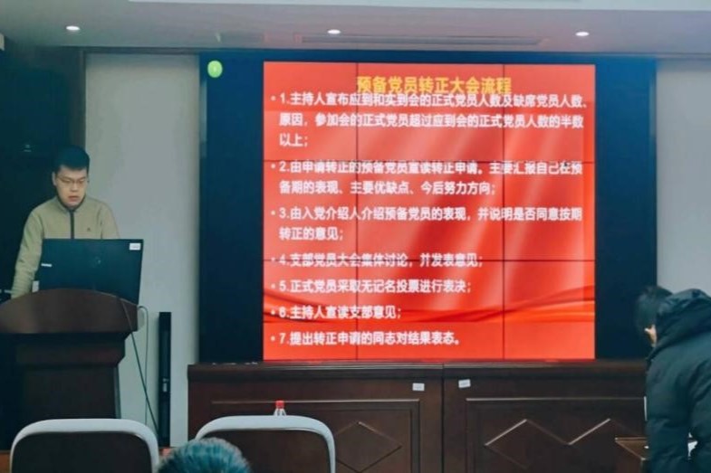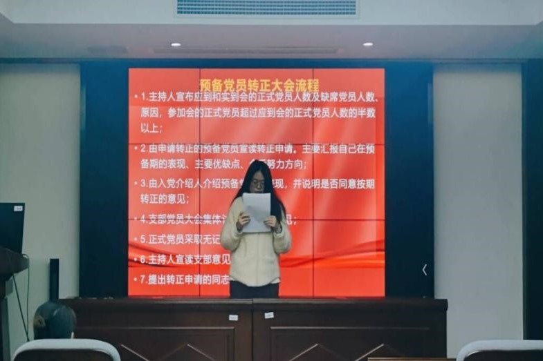 会议最后,支部大会宣布通过了预备党员转正的决议。支部书记郑繁简同志对三位预备党员如期转正表示祝贺,并对其表示殷切期望:各位党员同志要践行初心,担当使命,用实际行动践行入党誓言,为党和人民贡献自己的力量。