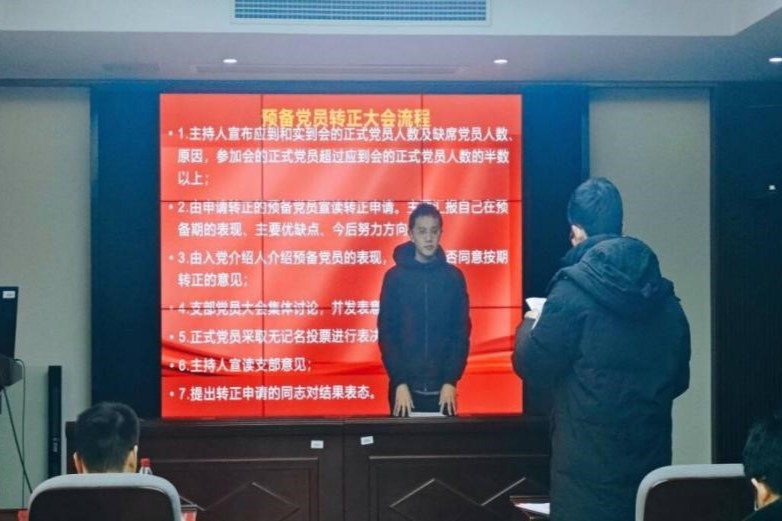 会议伊始, 郑繁简同志对会议流程进行了介绍。紧接着,赵祥康、路佳、彭程依次宣读《转正申请书》,对预备期一年内自己的理论学习、思想转变、学习生活、支部工作等方面进行汇报,并结合时事热点,阐述了自己在各个方面的优秀表现与不足之处,指出自身今后努力的方向,表明了正式加入党组织的坚定决心与态度。