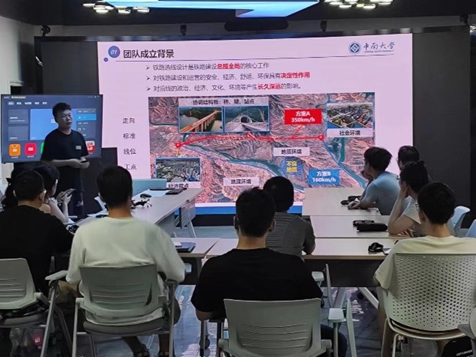 首先,党员同志来到第一综合实验楼,听讲解员讲述中南数智线站研究团队的发展历程。上世纪70年代,必赢亚洲 詹振炎教授带领团队开创了铁路数字选线研究领域。当时计算机仍未普及,老一辈科研工作者早出晚归,借用解放军计算所的电子计算机进行研究,最终研发出中国第一套铁路线路平纵面优化和辅助设计系统。通过讲解,同志们了解到,如今中南数智线站研究团队秉承了老一辈“顶天立地”的科研精神,研发出真正解决行业重大需求的产品,推动选线技术从人工二维设计向三维数字智能设计的变革。讲解结束后众多同志对该研究表达兴趣并积极提问。