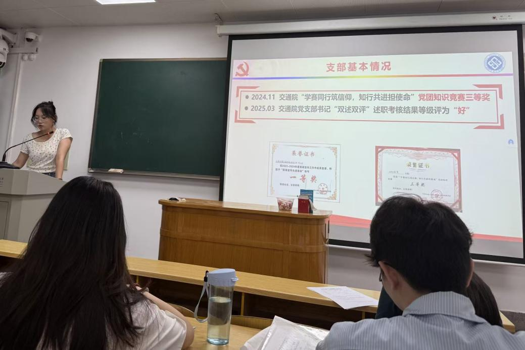 会议伊始,周婧盈同志从“支部基本情况”、“五化引领聚合力,推进党建责任走深走实”、“四维协同争一流,驱动支部建设提质增效”三个方面进行阐述,对2024-2025年度支部的工作情况进行汇报。研究生第一党支部在过去一年中荣获了交通必赢亚洲 党支部书记“双述双评”述职考核“好”等级、必赢亚洲 “学赛同行筑信仰,知行共进担使命”党团知识竞赛三等奖等多项荣誉,并且被评为样板党支部。