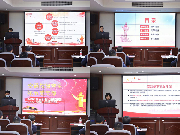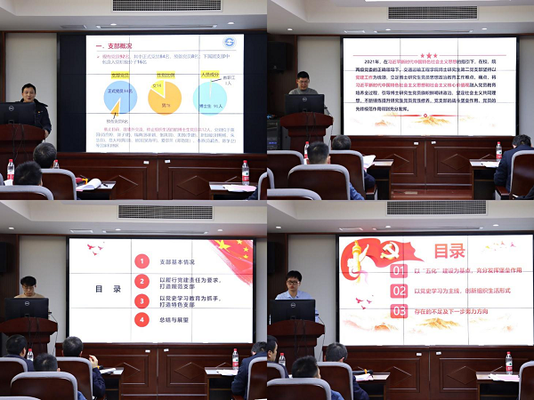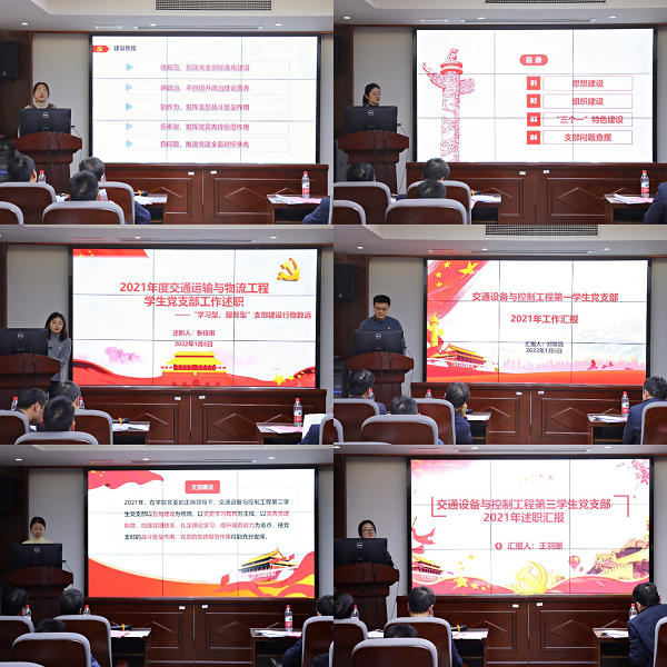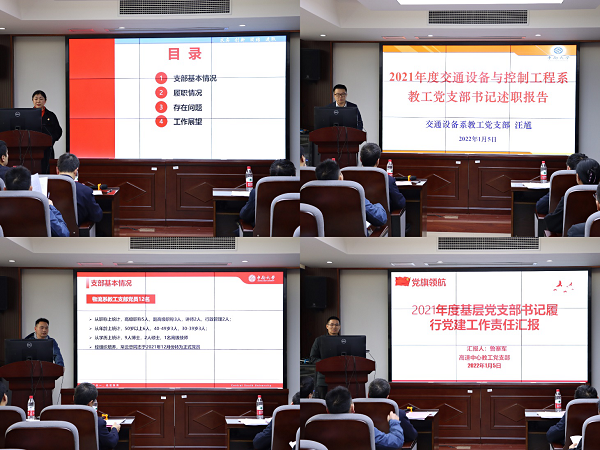 系教工党支部、交通设备与控制工程系教工党支部、物流工程系教工党支部、高速列车研究中心教工党支部的4个支部书记分别从支部2021年的基本工作情况、书记的履职情况、教职工党员这一年的科研成果、支部的组织生活等方面都进行了详细介绍,同时也都指出了这一学年在支部建设中存在的问题,以及未来改进的方向。学院党委成员对四个教工党支部进行了点评,在支部建设、党史学习教育等方面都有所进步,但仍然存在先锋模范带头作用还发挥不够的问题,下一步要继续加强。对于高速列车研究中心党支部尤其提出要配合学校做好寒假期间的疫情防控工作。