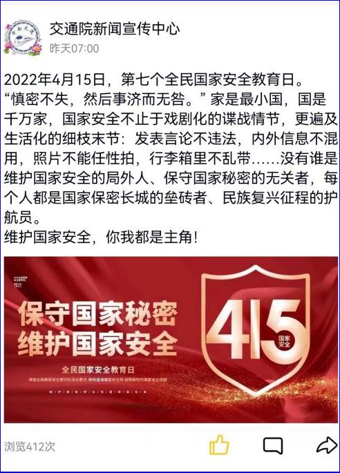 由交通院新闻宣传中心牵头,明确4月15日是第七个全民国家安全教育日,聚焦“树牢总体国家安全教育观,感悟新时代国家安全成就,为迎接党的二十大胜利召开营造良好氛围”的教育主题,普及相关知识,以图文结合的形式在学院官方QQ、微博同步更新动态,各班级官Q转发、跟评。
