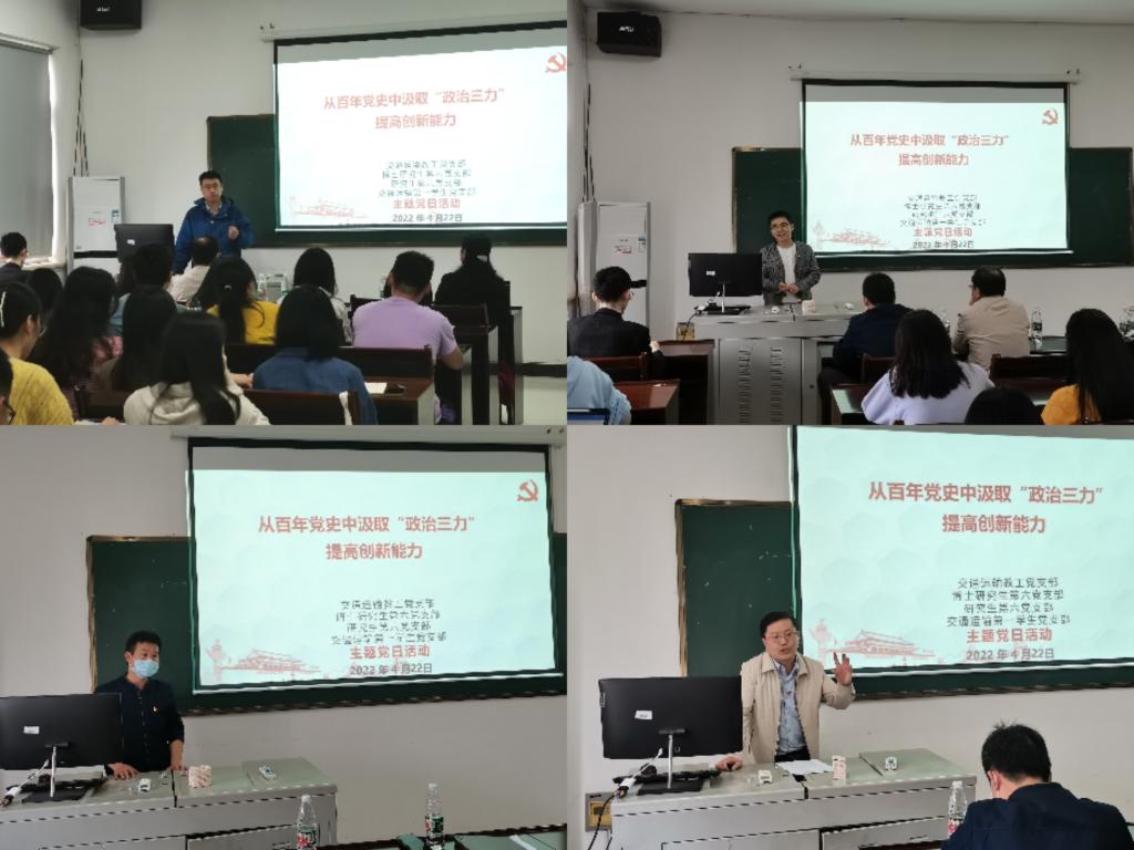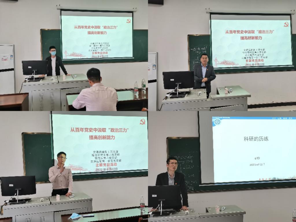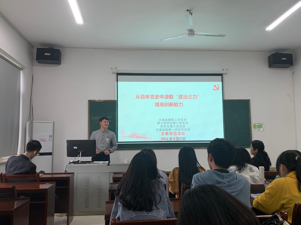 第一学生党支部在交通楼509开展“从百年党史中汲取‘政治三力’提高创新能力”联合党日活动。研究生第六党支部书记李冰洁同志主持本次会议,各党支部成员参加会议。