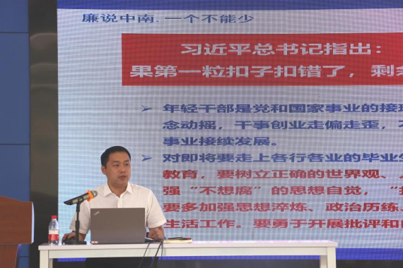 会议伊始,宋晓东副书记为毕业生带来“廉说中南,一个都不能少——扣正扣好第一粒扣子”廉洁教育讲座。首先,通过习近平总书记在庆祝中国共产主义青年团成立100周年大会上的金句阐述以及年轻干部违纪违法情况举例,宋书记指出,承担新时代使命的中国青年须不断加强自身廉洁自律修养,注重培养廉洁意识,树立牢靠理想信念。随后,宋书记强调,即将工作的毕业生应以习近平总书记为廉洁模范,以《中国共产党廉洁自律准则》为行动指南,切实做到廉洁修身及廉洁齐家。最后,宋书记对即将走上工作岗位的毕业生寄语——“勿以恶小而为之,勿以善小而不为”,希望承担重任的中南学子严守内心,时刻做到慎独慎微。