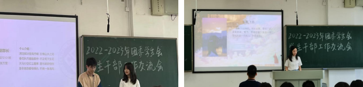会议开始,主持人简要介绍了院团委、学生会的各部门设置和人员构成。接下来,各部门部长轮流发言,介绍各部门职能、部门成员、工作简介以及工作经验。各部门成员依次上台展示自己,书友沙龙协会副部长张万里还作诗一首,祝愿每一位同学可以轻松愉快地学习生活,大会在轻松愉悦的气氛中进行着。