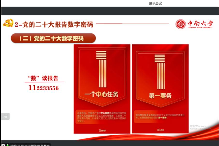 党课伊始,陈维亚老师带领党员同志们回顾了党的二十大报告主要内容,阐述了报告的起草过程和特点。随后,他重点讲述了二十大报告中出现的九个数字“112233556”。全党需要牢记一个中心任务和第一要务;全面建设社会主义现代化强国,必须坚持“两步走”战略安排;中国共产党为什么能,中国特色社会主义为什么好,归根到底是两个“行”;二十大报告回望了这十年来经历的三件大事,并提出了党员同志要牢记“三个务必”和五项重大原则,为了让党永葆生机和活力,全党还需要牢记五个“必由之路”和六个“必须坚持”。