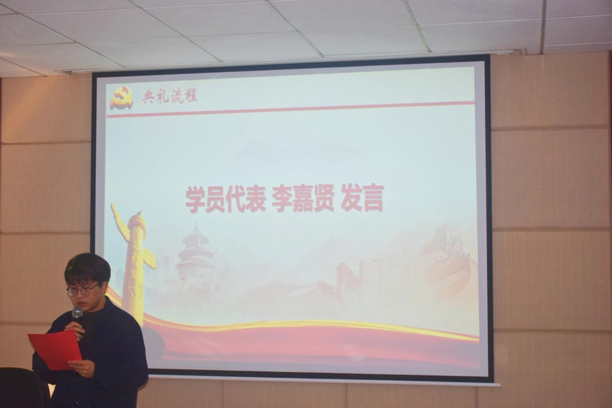 第二学生党支部李嘉贤同学发言。他带领同学们回顾了党的光辉历程,表示作为新时代新征程上的中坚力量,不仅要学习党的光辉历史,更要汲取其背后的精神力量,用党的科学理论武装头脑,提高自身道德修养,努力把自己培养成党和人民需要的高素质人才。作为培训班的一员,李嘉贤同学代表全体学员向党组织作出保证,期许所有同志在本次培训中能够有所收获。