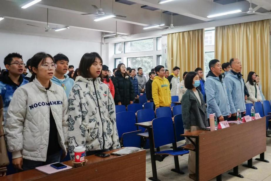 典礼第一项,主持人宣布典礼开始,全体起立奏唱国歌。