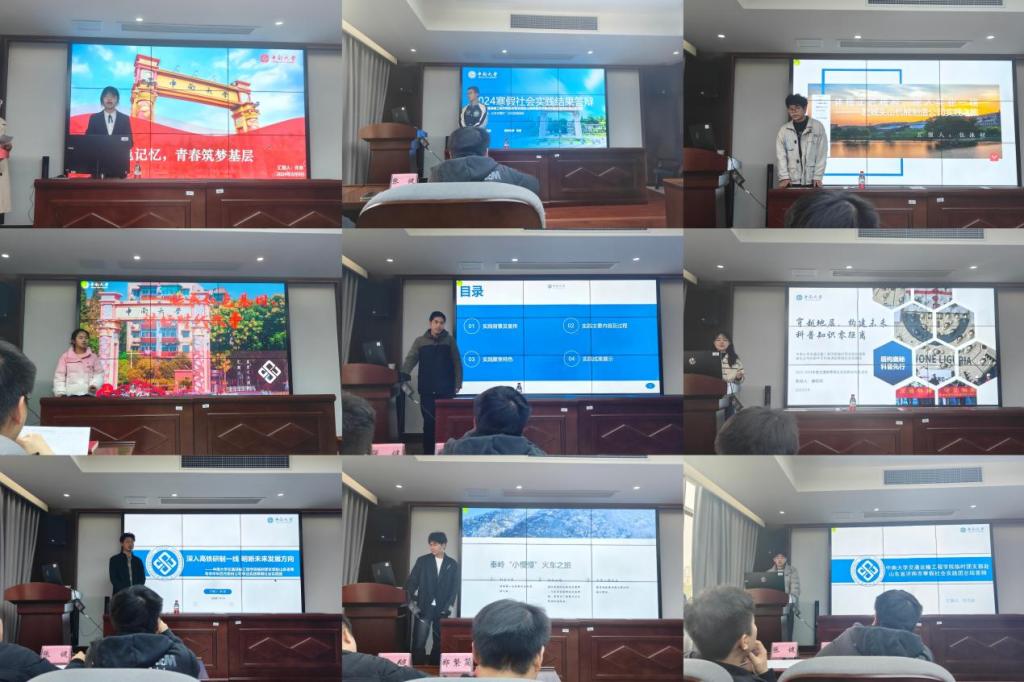 随后,18支队伍的代表依次上台汇报,从实践背景、实践过程、实践收获和实践成果等方面汇报工作。他们或聚焦特色,问访调研;或传承红色基因,讲时代故事。他们在全国多个省份、地区留下了中南足迹,贡献了交院智慧。他们以青春之我服务于人民,通过将校园学习所获的理论知识转化为实践行动,答好了“社会实践”这份答卷。