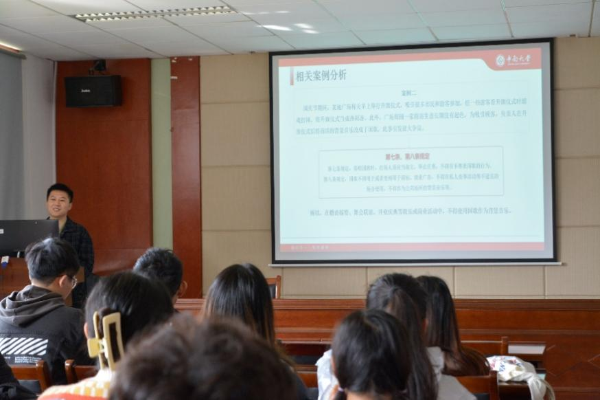 随后,张健老师为同学们作《国歌法》的宣讲。张老师带领同学们了解了国歌法的立法过程,对国歌法的具体内容进行逐条分析和解读,最终还通过案例分析加深了同学们对《国歌法》的理解。