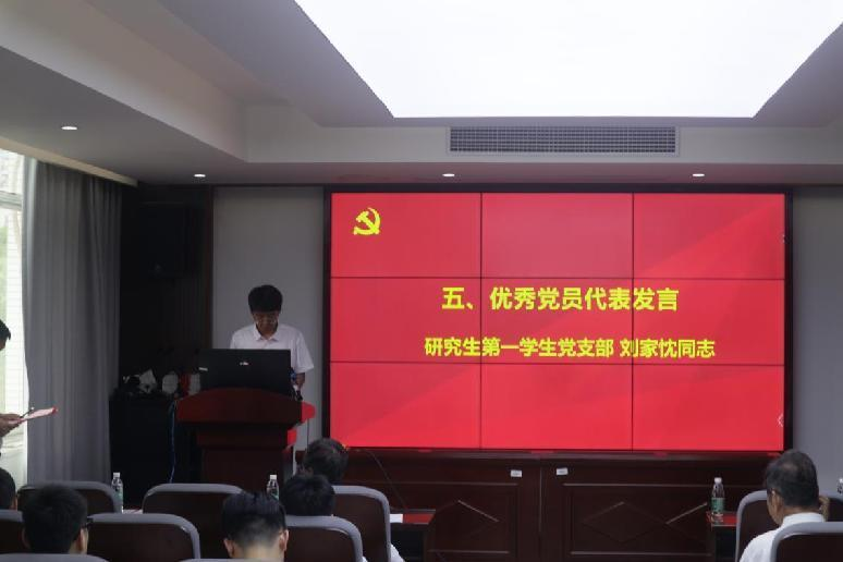 在颁奖仪式后,优秀党员代表刘家忱发言。他就个人在必赢亚洲 的成长历程、党支部的工作以及作为学生党员的责任和决心讲述自己的心路历程,表达了对学校、党组织的感激之情;并借此机会表达了三点决心:第一,提高科研创新能力,加强专业理论素养;第二,积极参与党建工作,助力必赢亚洲 党建发展;第三,树立远大理想抱负,不忘入党初心使命。最后,他用习近平总书记寄语青年的话语,鼓励学生党员坚定不移听党话,跟党走,怀抱梦想又脚踏实地,让青春在全面建设社会主义现代化国家的火热实践中绽放绚丽之花。