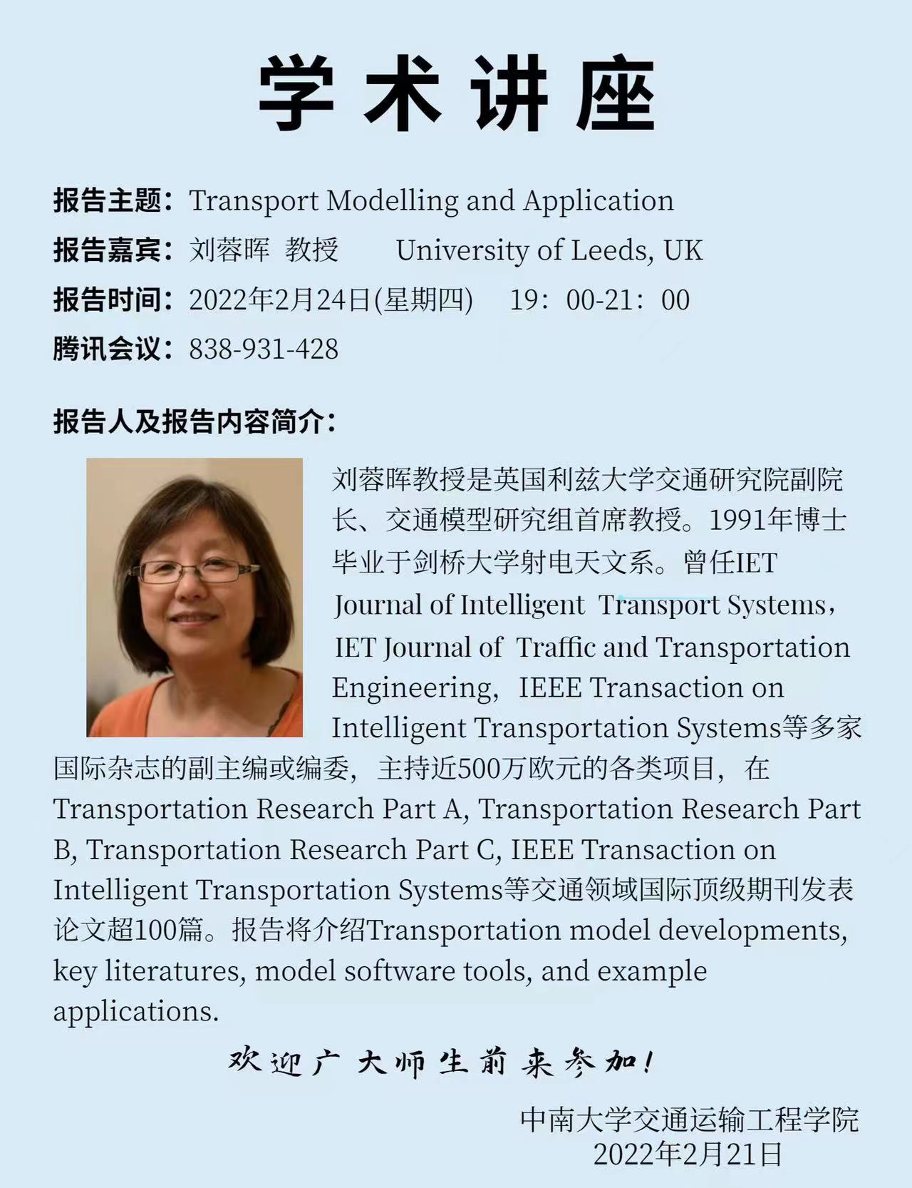 刘蓉晖教授是英国利兹大学交通研究院副院长、交通模型研究组首席教授。1991年博士毕业于剑桥大宁射电天文系。曾任IET Journal of Intelligent Transport Systems,ET Journal of Traffic and Transportation Engineering, IEEE Transaction on Intelligent Transportation Systems 35国际杂志的副主编或编委,主持近500万欧元的各类项目,在Transportation Research Part A, Transportation Research Part B, Transportation Research Part C, IEEE Transaction on Intelligent Transportation Systems等交通领域国际顶级期刊发表论文超100篇。报告将介绍Transportation model developments,key literatures, model software tools, and example applications.