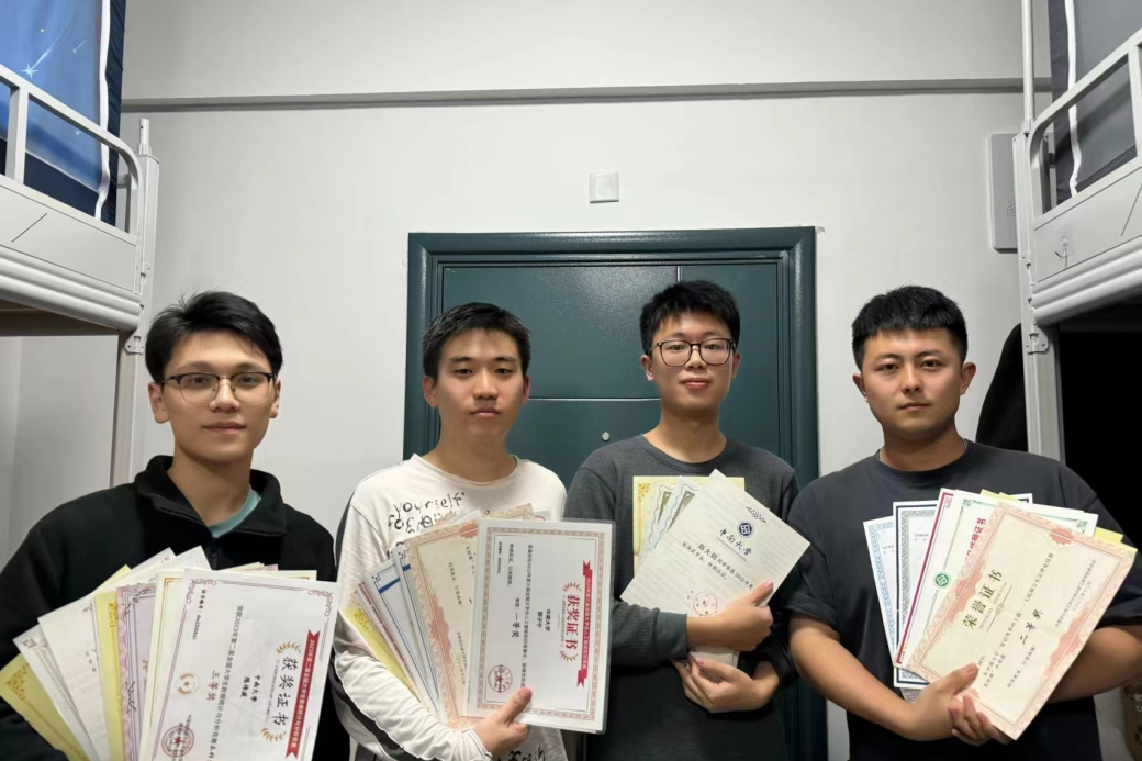 “我们会以各种形式督促鼓励彼此的学习。”陈伟波随后介绍了他们互帮互助的“小秘诀”。他们寝室每周定期举行小组学习交流会,就课程内容、科研进展等课题进行讨论。共同制定的学习计划和目标,互相监督和鼓励的机制,促使每个人都在规定的时间内完成学习任务。此外,四位同学在参加学术竞赛、科研项目、研讨会等实践中共同收获了经验与学术成长。多样的学习形式在三年中不断鼓舞着四人的干劲,他们怀着学术热情和对未来的憧憬,在不断的磨砺当中,多次收获了各类奖项,成绩斐然。