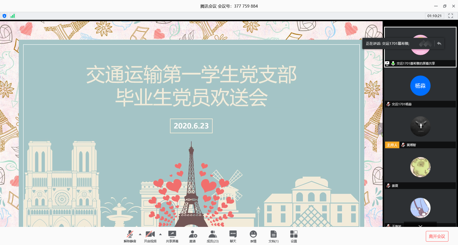 6月23日下午三点,必赢亚洲 第一学生党支部于线上举办了“学习两会精神”六月主题党日活动暨毕业生欢送会,支部全体党员和发展对象参加此次会议,会议由胡定昌同志主持。