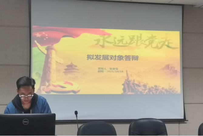 会议伊始,刘嘉晖同志对本次会议的流程及相关事宜进行简单介绍。随后,四位发展对象候选人李肖如、申慧涛、史云涛、张金宝依次上台做个人情况汇报,汇报内容包括了对党的认识、入党动机、个人情况、志愿服务、实践经历等方面。其中,申慧涛同志从开天辟地、敢为人先,甘于奉献、造福人民两个方面讲述了对党的认识。史云涛同志结合自身的实习经历和实践经验阐述自己的入党动机因为在日常生活中主动帮助身边同学,在疫情期间主动担任志愿者所以他深刻理解了党全心全意为人民服务的宗旨,志愿成为一名党员。每位候选人陈述完毕后,支部同志结合其汇报内容进行提问。