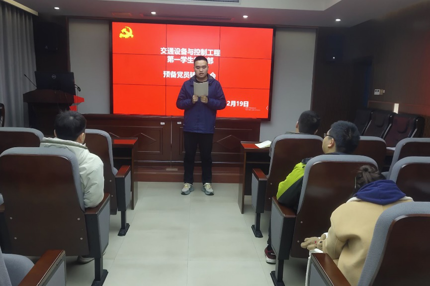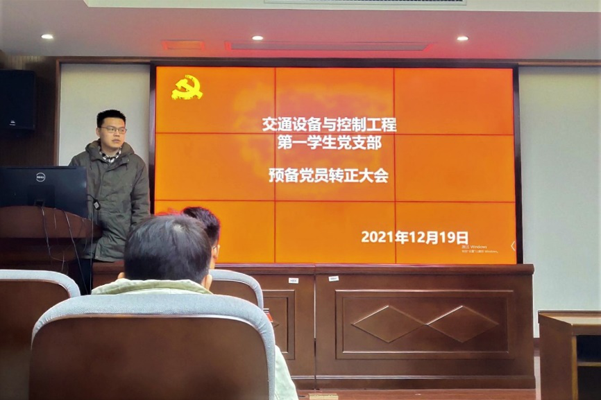 12月19日晚,交通设备与控制工程第一学生党支部在交通楼425举行了预备党员转正大会,讨论韩世博、侯泓阳、刘江浔、林心怡、石浚茹五位同志的转正事宜。本次会议由侯泓阳同志主持,支部全体党员参加。