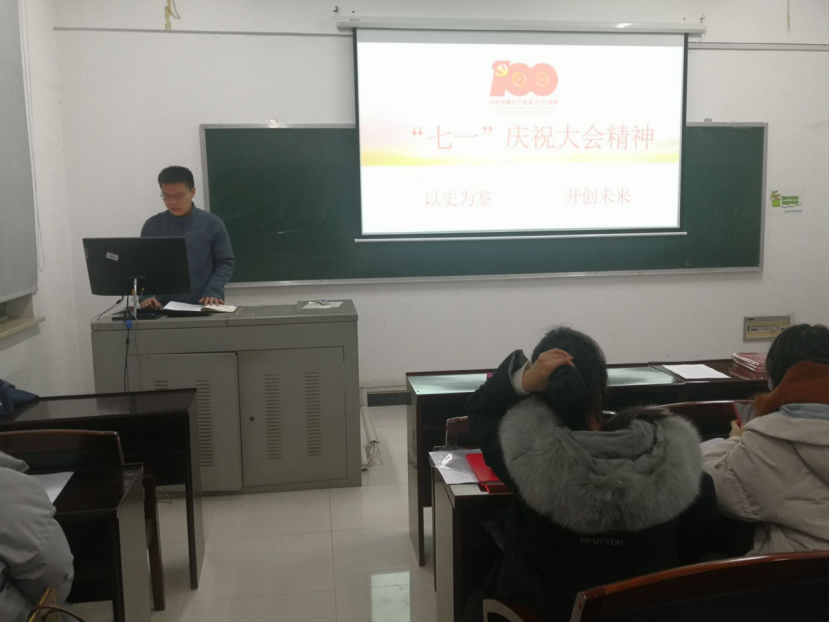 本次党课以学习习近平总书记在庆祝中国共产党成立100周年大会上的重要讲话精神为主题,按照“回顾中国共产党百年光辉历程、诠释中国共产党的伟大建党精神、展望中华民族伟大复兴——九个必须、寄语广大青年、号召全体中国共产党员”五个部分展开。党支部书记郑繁简从中国共产党团结带领中国人民创造的四个伟大成就讲起,对党成立以来的四个时期的重大历史事件进行了概述。进而带领党支部党员回顾中国共产党的精神之源——坚持真理、坚守理想、践行初心、担当使命、不怕牺牲、英勇斗争、对党忠诚、不负人民的伟大建党精神。最后回顾总书记对青年和广大共产党员的寄语和号召。