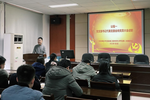 会议伊始,由党支部书记樊佳俊老师代表支委会向党员大会述职。樊佳俊老师带着同志们回顾了2021年博二支部参与举办的合唱比赛、《长津湖》观影、与设备系教工支部的经验交流分享等活动。同时,樊佳俊老师也对上一年度的支部工作进行了总结和反思。