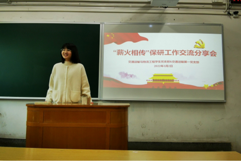 第一学生党支部在世纪楼B202开展“薪火相传”交流分享会之保研与工作专场。本次交流会邀请了汤书宁、蒋欣珏、曹腾、曾凡铭、游弋、杨杰6位18级的同学进行经验分享,近百名交通院的同学参与了本次分享会,会议由支部成员肖奕忆同志主持。