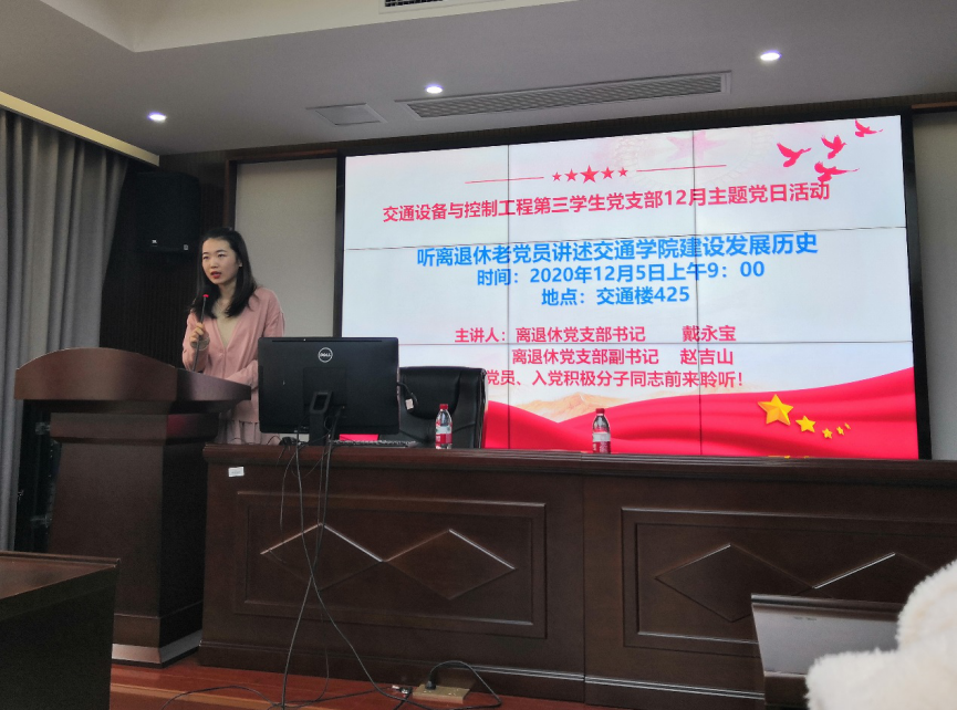 2020年12月5日上午九点,交通设备与控制工程第三学生党支部在交通楼425举行了12月党日活动,活动主题为“坚守初心,争做先锋——听离退休老党员讲述铁道必赢亚洲 建校史”。主要内容是听离退休老党员讲述必赢亚洲 铁道必赢亚洲 和交通院建设发展历史,本次党日活动邀请到了离退休党支部书记戴永宝和离退休党支部副书记赵吉山,支部在校党员和入党积极分子,发展对象参加本次活动,报告会由支部预备党员郭秉筠同志主持。