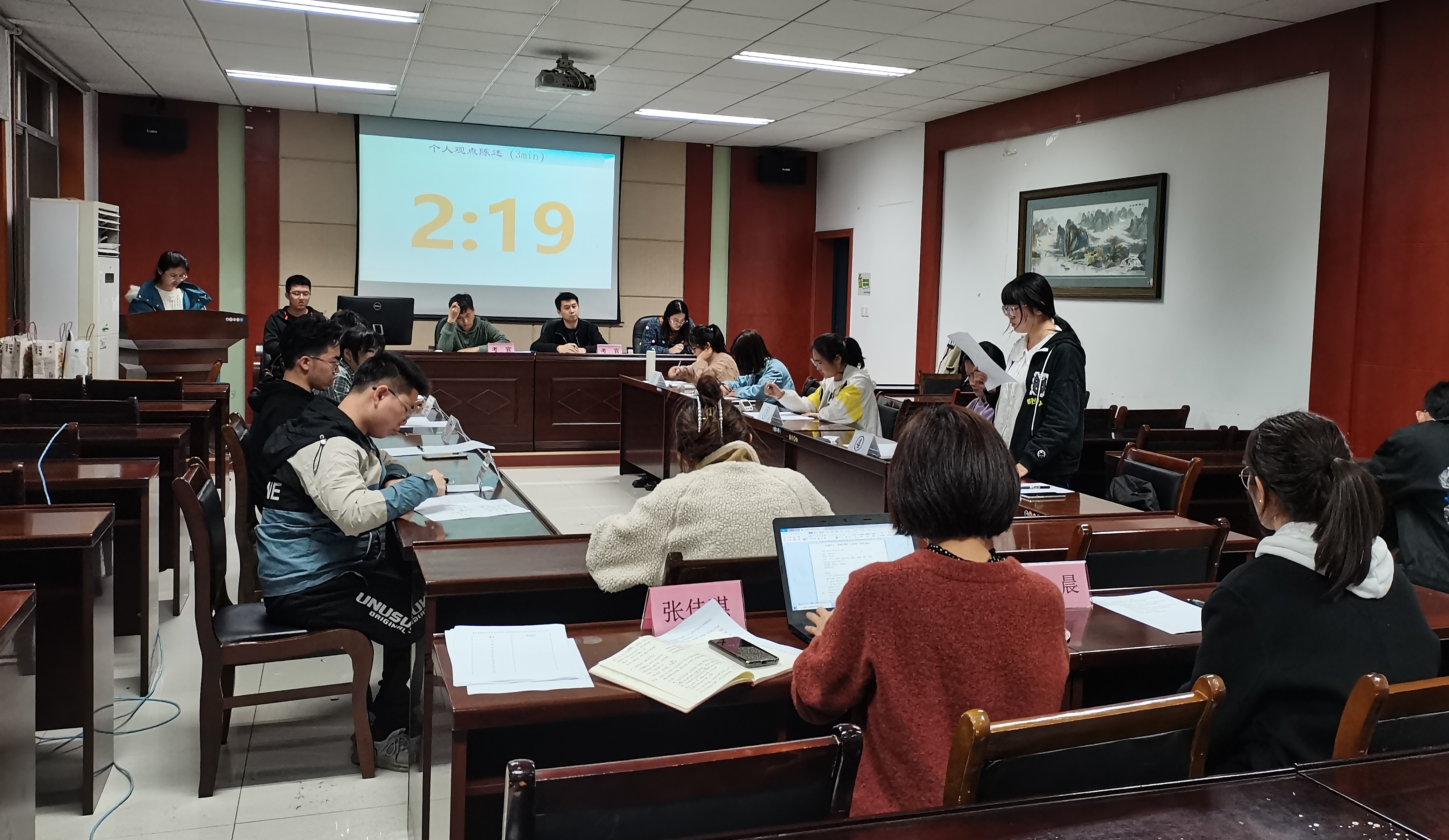 本次初赛共有 11名参赛选手。比赛开始后,各选手按抽签顺序依次进行1分钟的自我介绍,随后开始陈述个人观点,进行30分钟自由交叉讨论并完成小组总结陈词。在讨论过程中大家发言积极,清晰地表达出自己的意见和看法,并且仔细倾听他人意见,为小组讨论贡献自己的力量。讨论氛围十分热烈。随着讨论的深入,选手们的意见逐渐达成一致,一致推选6号选手代表小组做总结陈词。总结之后,由各位评委就选手们讨论中的观点、表现进行提问,并对选手们的表现进行整体复盘和点评。