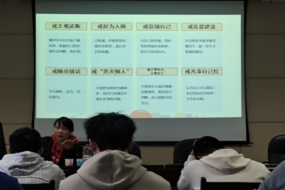 通过这次的心理培训,同学们不仅仅学到了丰富的心理学知识,更学习到了作为帮助别人的一方,应当在保持自我身心健康的前提下,尽可能地去关心、帮助身边需要帮助的同学,做老师与同学之间心灵沟通的桥梁,努力用学到的知识和自己的力量让每一位同学都可以感受到心灵的温暖。