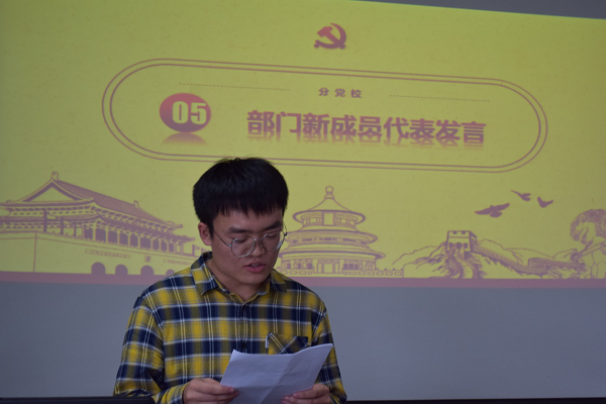 部门新成员代表、副部长杨佳乐同学发言。他阐述了自己对今后在分党校管理部工作的展望,表示了自己会承续前人荣光、担负责任而行的决心,并对部门新成员提出真挚期望,希望新成员能具有强烈责任心,认真做事、认真做人,发挥自己的优势将部门建设得更好。