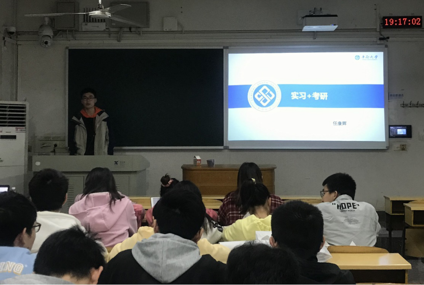 看完视频后,大家一起就近期考研就业心理问题展开交流。朱锦敖同学为大家分享了缓解焦虑的若干方法,在他之后,任康辉学长为考研的同学们分享了实习期间备战考研的经验。首先,学长介绍了实习任务、收获和各个实习地点的有关情况。接着,他从如何选择实习住宿队友和小组队友、合理分配时间、日常休息、锻炼和调整心态六个方面为考研的同学提出了实用的建议。