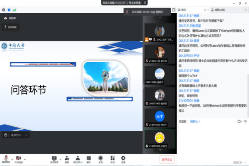 分享结束后,同学们踊跃提问。两位主讲人针对大家的问题,结合自身的科研与学习经历进行了详细解答,并鼓励同学们通过阅读与实践不断提高自己的科研素养与实践能力。