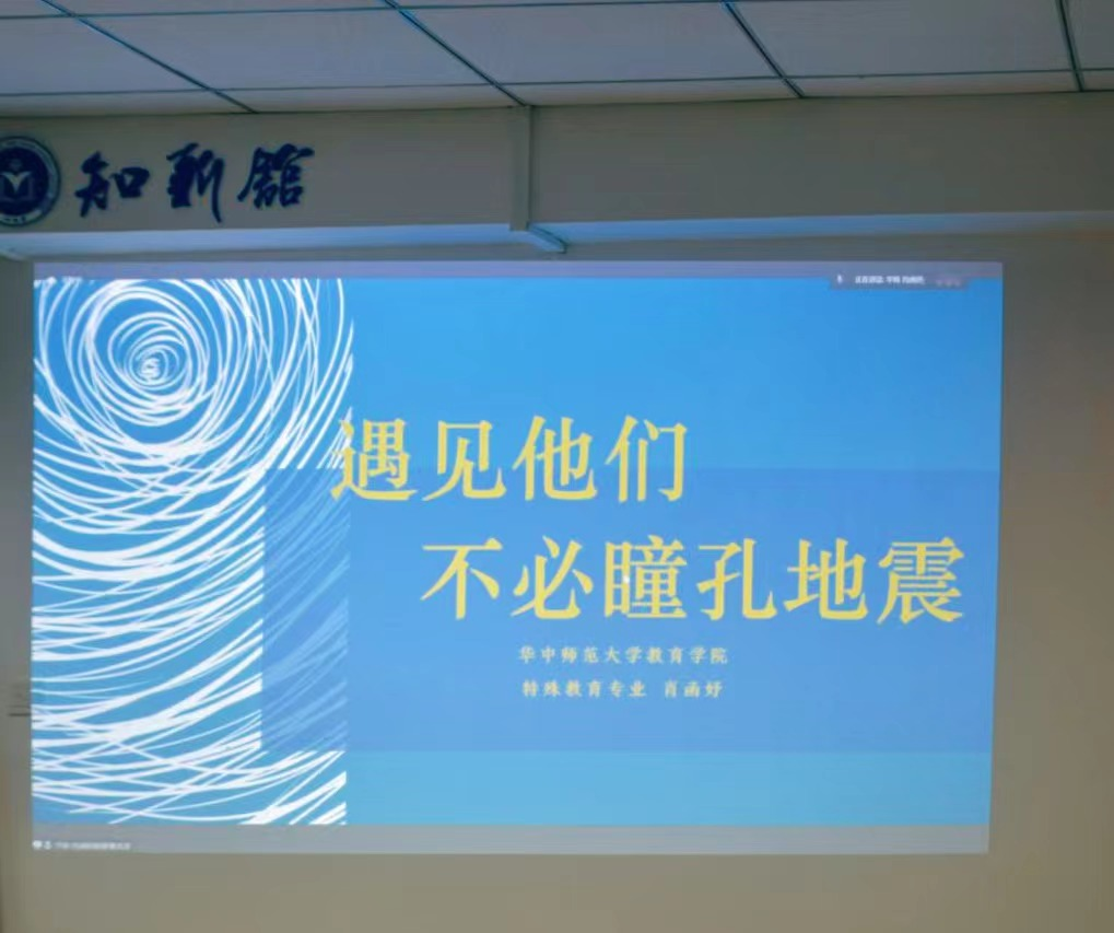张健老师发言结束后,来自华中师范大学特殊教育专业的肖函妤同学通过对残障人士定义和分类的讲解,深化了同学们对残障人士的认知。她从平等、平视、平常心三个方面出发,向同学们介绍了残障人士敏感的心灵和不同寻常的行为。她提到,残疾人不是一个符号,而是一群撑伞的人,之所以看不见他们,不是因为他们不愿从伞下走出来,而是因为雨还没停。同时,她还提出了“保持视线同一高度,我们一起漫步”的倡议。肖函妤同学的话语点亮了每一位志愿者的心灵。