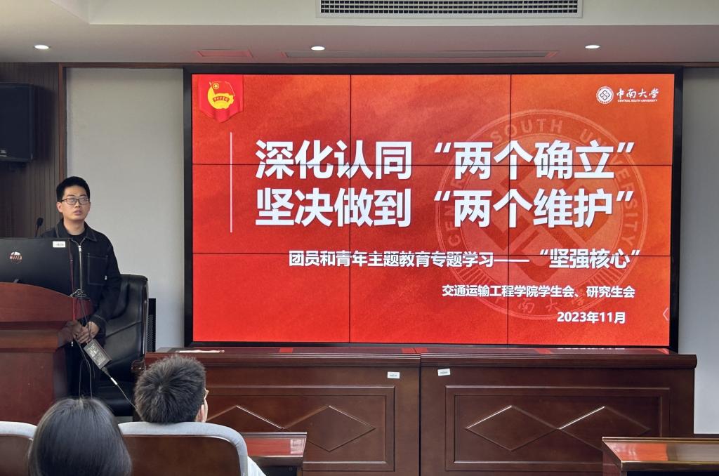 2023年11月22日下午,交通院团委、学生会、研究生会于交通楼425开展以“深化认同‘两个确立’,坚决做到‘两个维护’”为主题的“坚强核心”专题学习会,旨在进一步坚定团员青年投身中国特色社会主义事业的信念,为实现中华民族伟大复兴中国梦的征途上提供了坚实的思想基础和精神动力。本次学习会由院团委副书记卜憧亦主持,团委、学生会、研究生会全体干部成员参与。