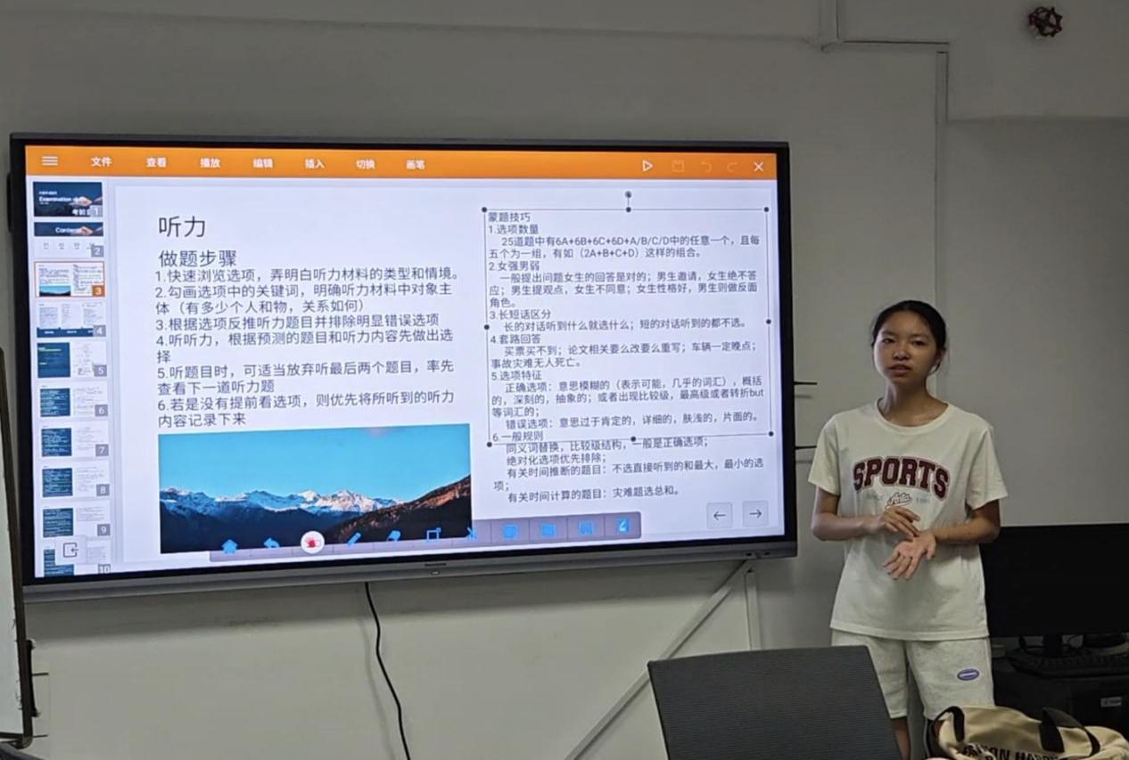 罗碧燃同学于知新馆团辅A室为同学们分享了大学英语六级考试技巧。她从六级听力的题型划分、时间安排、历年真题等方面剖析了英语六级考试中的重点、难点, 并向同学们分享英语六级考试的实用小技巧,同学们认真记录笔记。在讲解的最后,罗碧燃同学送上了真诚的祝福,给同学们打上了一记“强心针”。