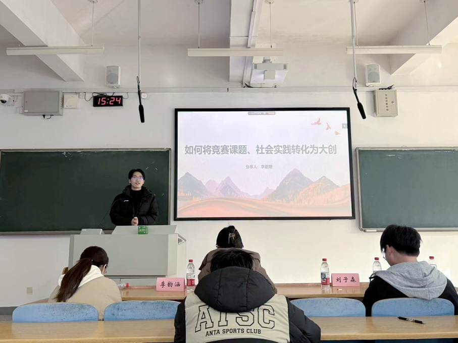 会议第二部分,三位赛事经验丰富的学长学姐进行参赛经验分享。李蔚翔同学介绍了大创项目从无到有的具体路径,从大创的定位与价值引入,重点分享了项目思路的主要来源,以及如何从生活中获取项目灵感。他以三个大创项目为例,鼓励同学们积极尝试,找到自己的兴趣点和目标。