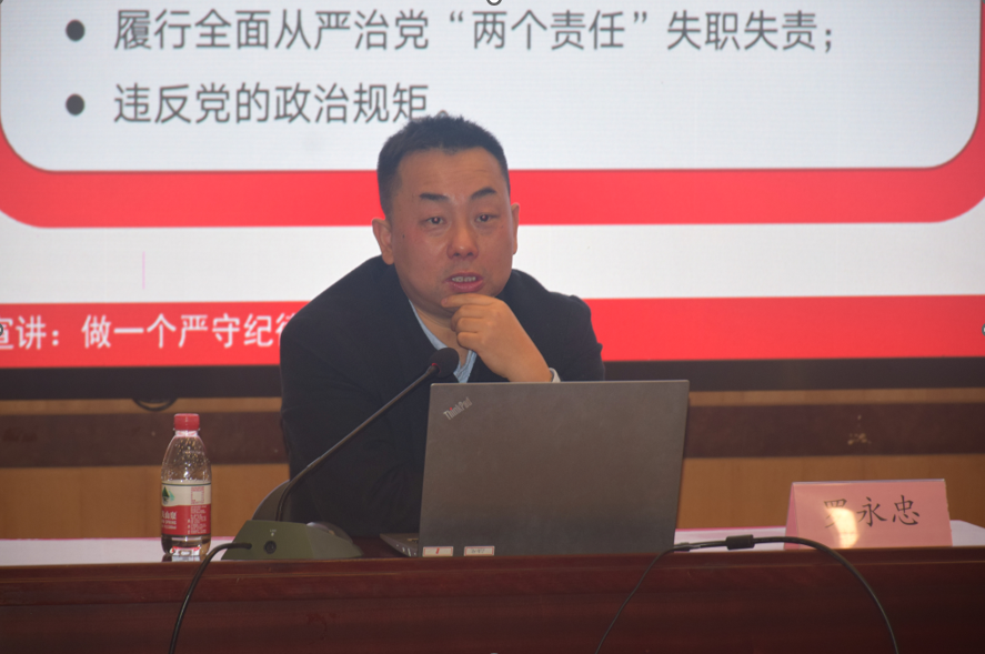 罗永忠副书记从习近平总书记关于党风廉政建设和反腐败工作的新理念、新思想、新论断等重要讲话精神出发,以保持清醒头脑,自觉遵守廉政“红绿灯”;明纪知纪守纪,从紧从严从实恪守纪律;强化责任担当,营造风清气正发展环境三个方面为重点,全面深入地进行了宣讲。他用生动而严谨的语言,以幽默与严肃巧妙结合的方式,剖析了多个违法违纪典型案例和反腐警示案例,深入浅出地解读了党的政治纪律、组织纪律、廉洁纪律、群众纪律、工作纪律、生活纪律六大纪律,引导和提高师生“尚廉”“践廉”的思想自觉和行动自觉。