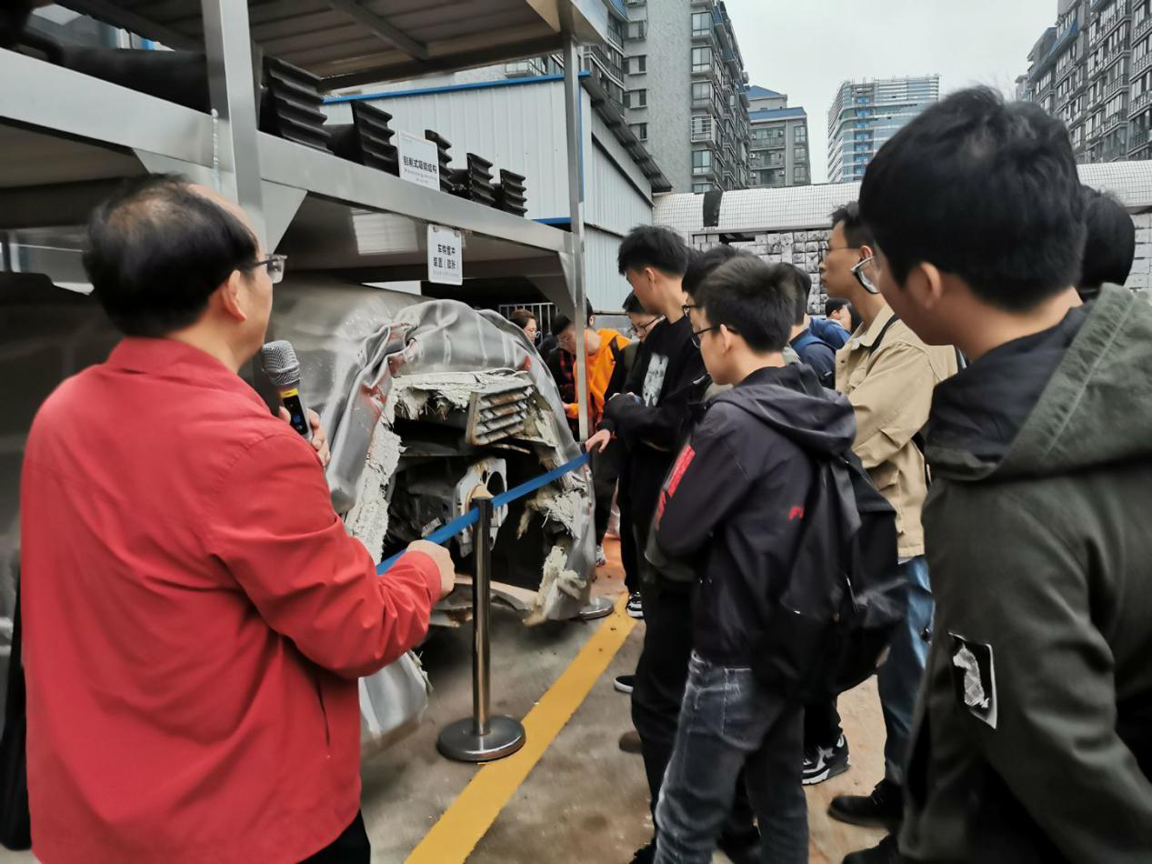 接着,在张健老师带领参观了实车碰撞实验室张健老师向同学们介绍了实验室的组成部分及各部分功能,并从材料、结构等不同影响因素讲解了碰撞吸能科研成果在高铁上的应用