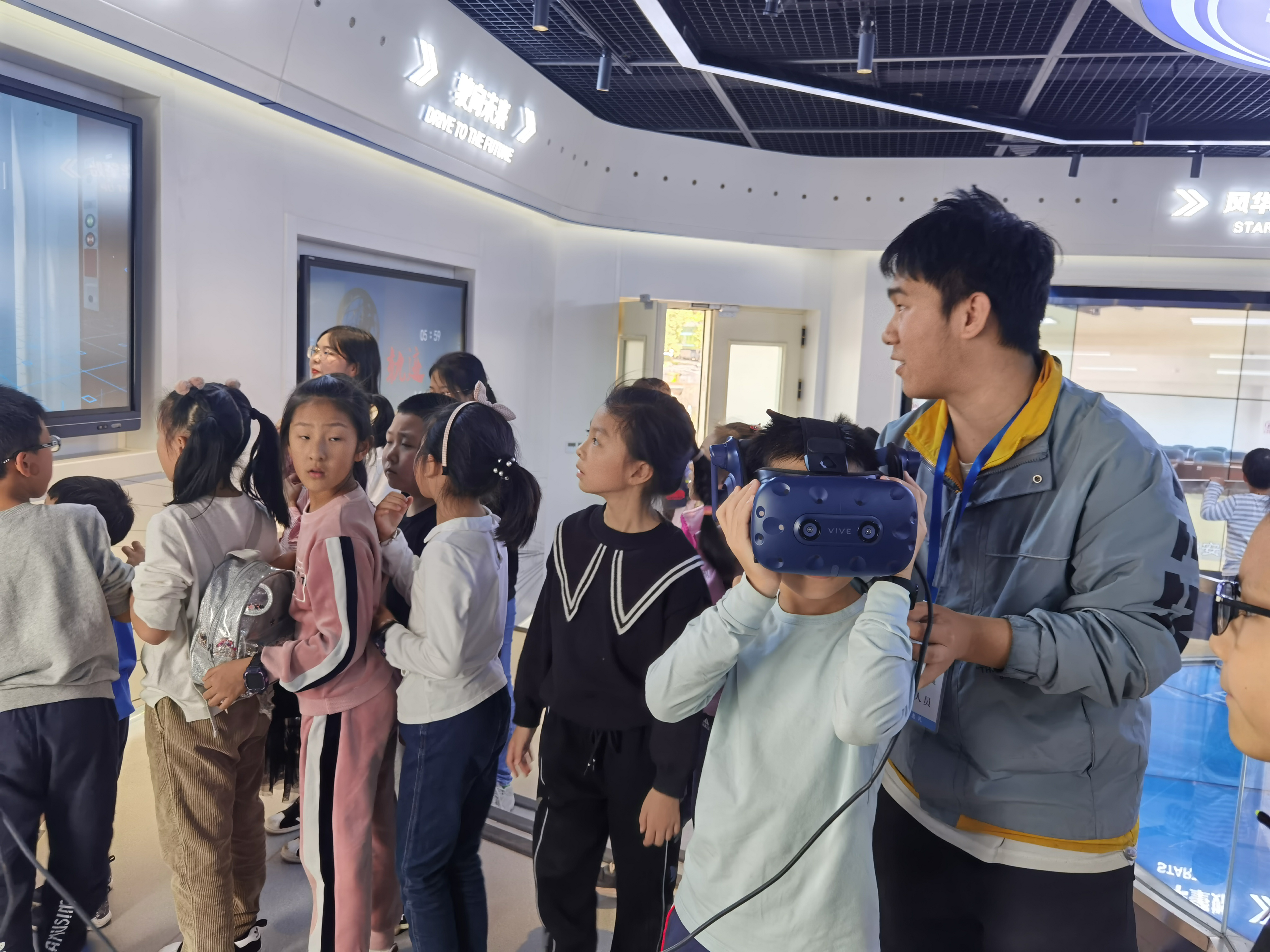 在我国先进轨道交通发展的重大贡献;在志愿者的指导下,小朋友们排队体验了VR设备,“亲身”来到了列车上,走进了驾驶室。