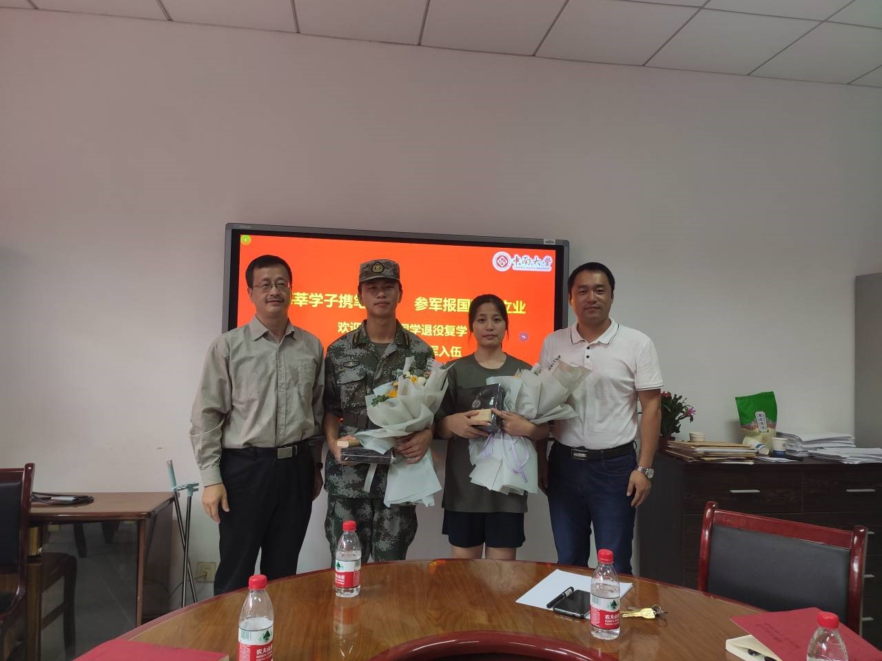 张佳琪老师和高辉老师深情回忆了两年前欢送龚智龙同学入伍的场景,对龚智龙同学的改变与成长给予充分的肯定,也提出了更高的期盼。宋晓东副书记首先对龚智龙同学的复学表示热烈欢迎,对吴婷同学通过选拔成功入伍表示祝贺,其次他希望两位同学尽快适应新的环境和集体,发扬中南精神,传承部队的优良作风。