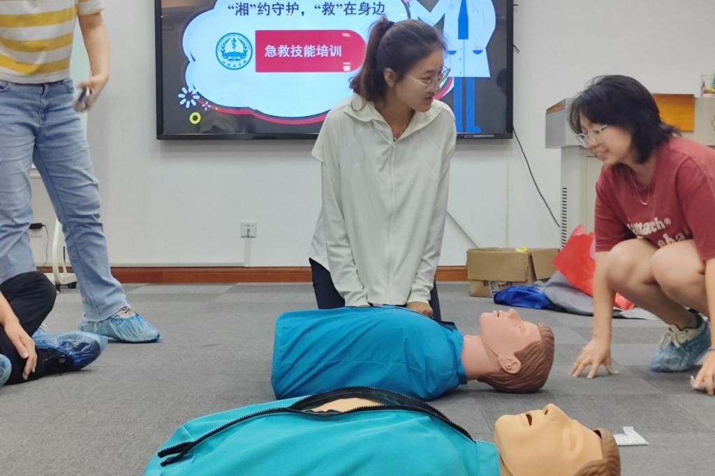 为丰富实践团成员们的急救知识,为三下乡活动的进行提供安全保障,7月1晚上19:00,实践团成员前往毓秀楼心理团体辅导教室229参加由湘雅红会急救导师队成员组织的急救科普课。在急救科普课堂上,成员们认真学习心肺复苏的每一个步骤和要领,近距离观摩专业的心肺复苏演示,实践完成心肺复苏全过程。随后,成员们进一步了解了AED(除颤仪)的使用方法。