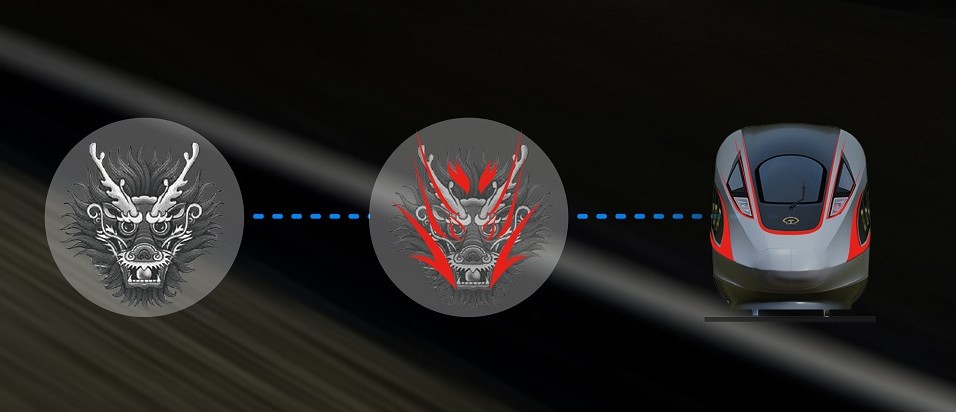 “复兴号”的车头造型很有特色。中国人长一张中国的脸孔,中国的车也要长一张“中国范”的脸孔。“复兴号”在头型设计中,融入了中国文化中“龙”的形象。车头的两条红飘带演变自龙的“髯”。整体造型十分飘逸,又气势如虹。