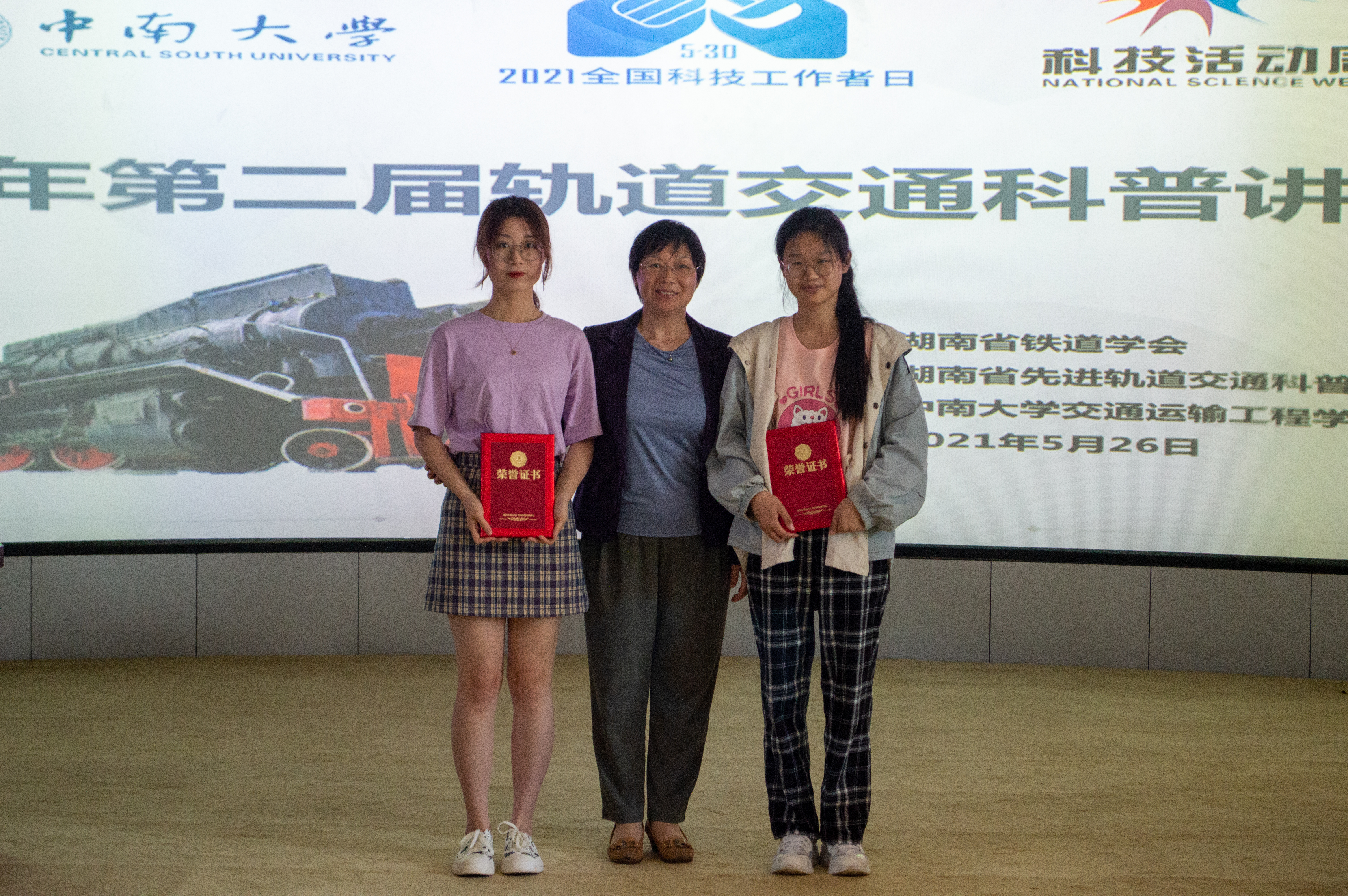 本次轨道交通科普讲解大赛入选了全国高校科协2021年全国科技工作者日活动,及2021年湖南省科技活动周活动。大赛吸引了众多轨道交通爱好者参加,充分激发了参赛者的科普热情和讲解潜力,营造了浓厚的科普氛围,为下一步科普工作的开展奠定了良好的基础。最后,出席本次比赛的评委老师、参赛选手及工作人员共同上台合影留念,并录制视频,向即将到来的“530全国科技工作者日”表达祝福。